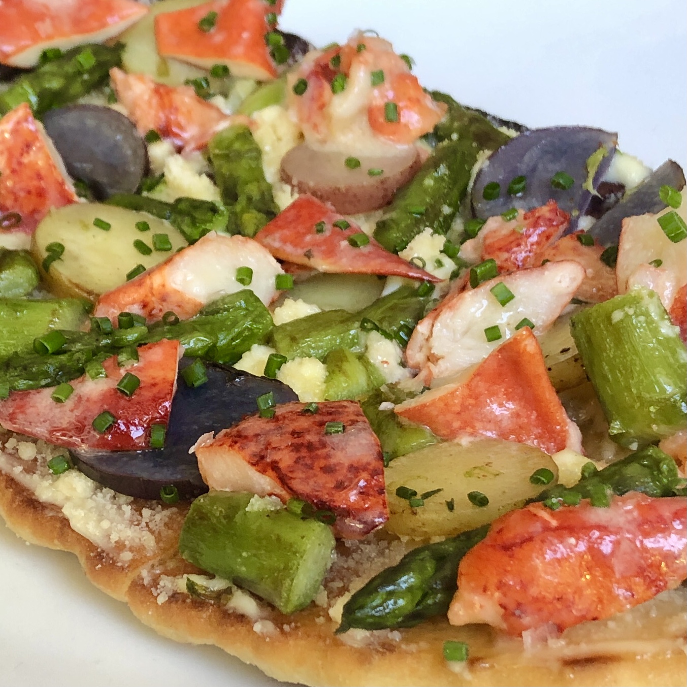 naan flatbread topped with butter poached lobster, asparagus, marble potatoes, saffron rouille and parmesan
